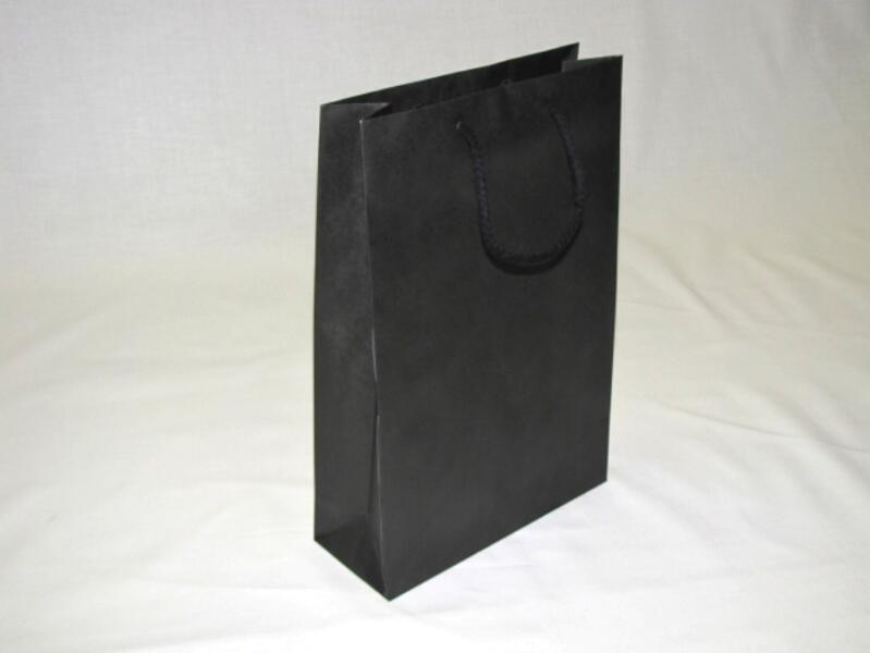 A zsinórfüles papírtáska 23×9×35 cm fekete színben tartós és elegáns választás. A zsinórfül elnyűhetetlen és egyben exkluzív megjelenést kölcsönöz a papírtáskának. A táska színével azonos, erős rögzítéssel. A táska erős, strapabíró kartonból készült, talperősítéssel. A viszonylag nehéz és éles tárgyak tárolására, csomagolására is tökéletesen megf