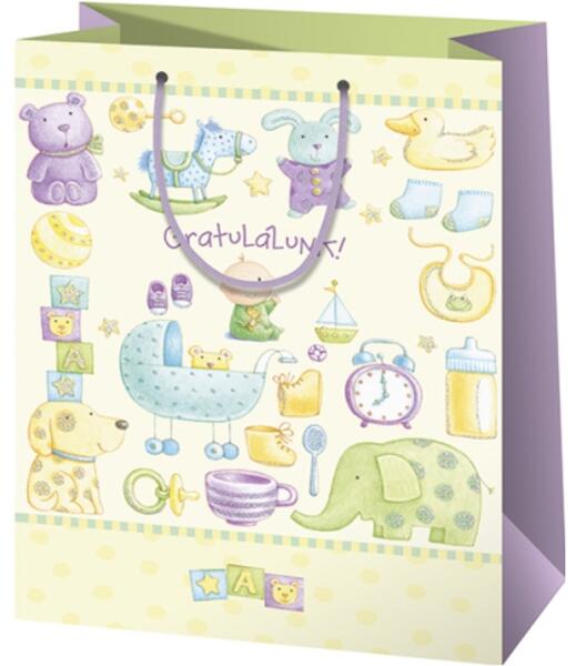 Gratulálunk! mintás nagy méretű exkluzív ajándéktáska 27x14x33cm-es Hivatalos magyarországi forgalmazótól. Leírás: Babaváró partykra remek választás ez a különleges, cuki mintákkal ellátott ajándéktáska, melyen a Gratulálunk! felirat olvasható. A Cardex kiváló minőségű nagy ajándéktáskái erős zsinór fülekkel és erősített talprésszel készülnek, hogy a neh