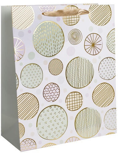 Dísztasak matt 18x23 cm kör mintás arany " M " méretű dísztasak anyag: 210 g/m2 súlyú papír formátum: álló felület: matt fogantyú: szalagfül