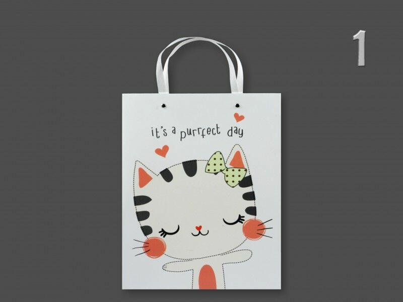 Ajándéktasak rajzolt állatos fehér közép 18x10x23cm 4féle 02753 4 féle típus választhatóBefoglaló méretek 18x10x23 cmDísztasak MAnyaga papír