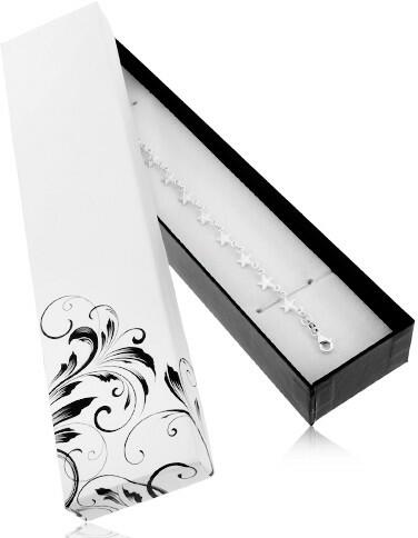 Ajándékdoboz nyakláncra, karkötőre vagy órára. A teteje fehér az alja pedig fekete árnyalatban. A dobozka felülete sima, matt és virág mintával díszített. A belsejében található a fehér párnácska bemetszésekkel és két gumicskával az ékszer odaerősítéséhez. Alkalmas karkötőre, nyakláncra vagy órára. Méretek: 50 x 230 x 28 mmBelső méret: 45 x 225 mm