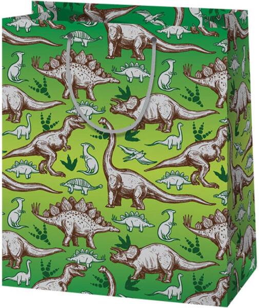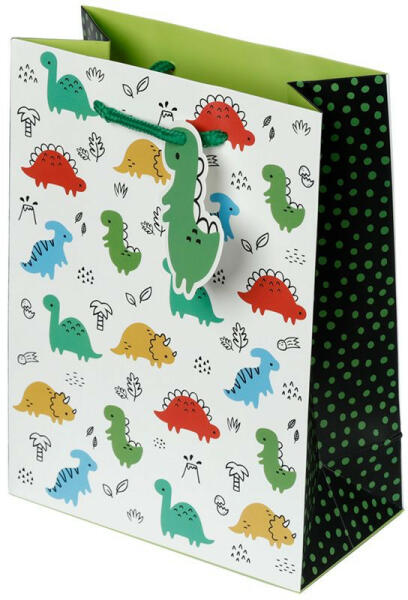 Dinoszauruszos közepes méretű ajándéktáska 18x23x10cm-es Hivatalos magyarországi forgalmazótól. Leírás: Egy kivételes és igazán figyelemfelkeltő közepes méretű ajándéktáska, amely a dinoszauruszok iránt érdeklődő gyerekeknek készült. A táska élénk zöld színével és a rajta lévő dinoszauruszos mintával azonnal megragadja a tekintetet. A mintázatban feltűnő, ha