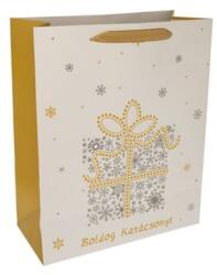 Cardex: "Boldog Karácsonyt!" arany színű nagy ajándéktáska 26x13x33cm Hivatalos magyarországi forgalmazótól. Leírás: Ez a Cardex "Boldog Karácsonyt!" feliratú arany színű ajándéktáska elegáns és ünnepi csomagolást biztosít a karácsonyi ajándékaidnak. A táska arany háttere és finoman csillogó mintái az ünnepi fényeket idézik, míg a díszes fenyőágak, karácsonyi
