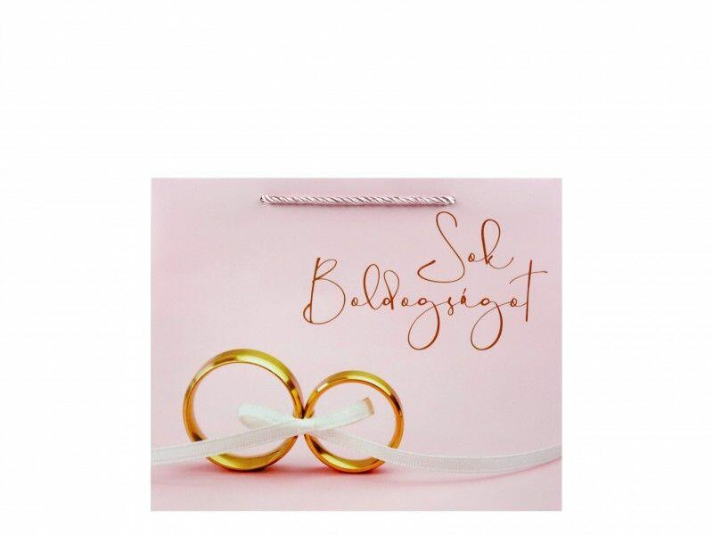 Ajándéktasak fekvő Sok Boldogságot gyűrűs közép 23x10x18cm 02118 Befoglaló méretek 23x10x18 cmDísztasak MAnyaga papír