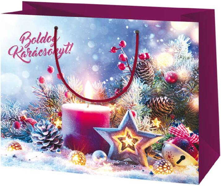 Boldog Karácsonyt feliratos közepes méretű exkluzív ajándéktáska 18x10x23cm Hivatalos magyarországi forgalmazótól. Leírás: Ez a közepes méretű ajándéktáska tökéletes választás mindenki számára, aki szeretné kifejezni ünnepi jókívánságait stílusos és elegáns módon. A "Boldog Karácsonyt" felirat a táska bal felső részén helyezkedik el és az üzenet fontosság