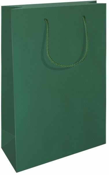 Zöld színű zsinórfüles ajándéktáska, A4 álló méretben. Alapanyag: 150g/m2 prémium papír, matt fóliával, 400g/m2 talp és fülkarton erősítéssel, 5mm vastag 2x38cm hosszú PP zsinórfüllel.
