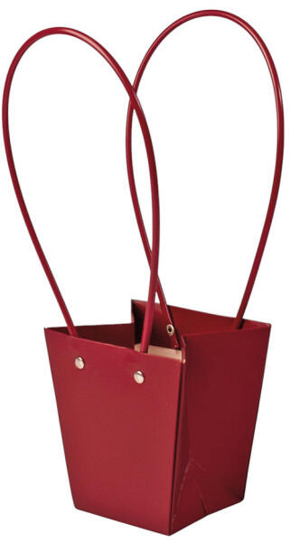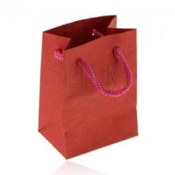 Kis ajándéktasak téglalap alakú, matt felületű és piros színű. A táska felületén rózsa lenyomatok láthatóak. A felső részen rózsaszínes lila zsinórok vannak átfűzve. Méret: 60 x 80 x 40 mm