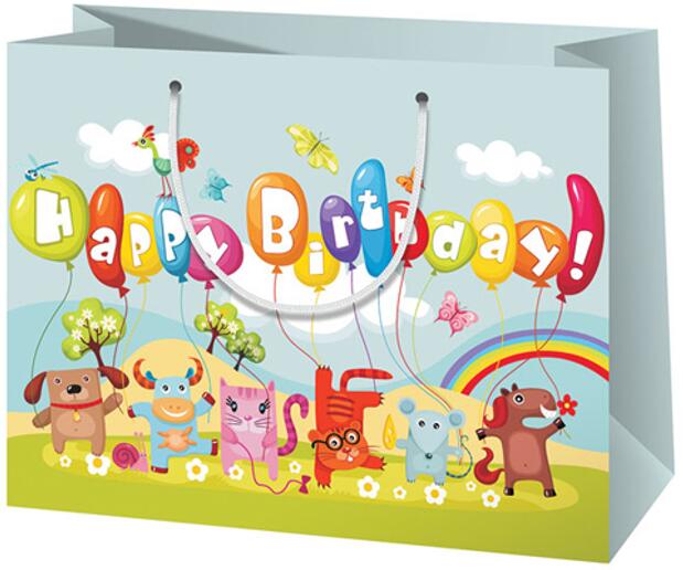 Közepes méretű állatos ajándéktáska "Happy Birthday" 18x23x10cm Hivatalos magyarországi forgalmazótól. Leírás: A tökéletes ajándékhoz csak egy tökéletesen csomagolás hiányzik? Ez az ajándéktáska remek választás lehet a szülinapi ajándékhoz, hiszen aranyos és vidám hangulatot áraszt magából. Az ajándéktáskán több különböző állat látható, kezükben lufikk