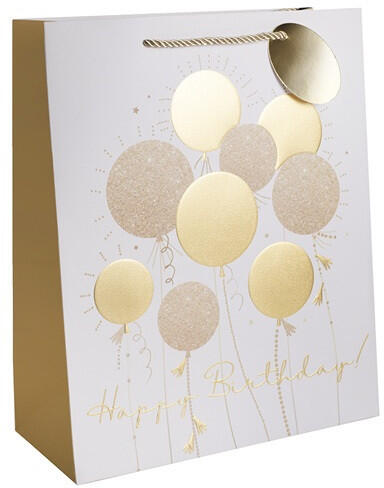 Dísztasak matt 26x32 cm arany lufik Happy Birthday! felirattal 26x32 cm-es méretű dísztasak anyag: 210 g/ m2 súlyú papír formátum: álló felület: matt szalag füles