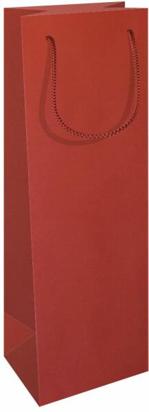 Piros színű zsinórfüles ajándéktáska, italos méretben. Alapanyag: 150g/m2 prémium papír, matt fóliával, 400g/m2 talp és fülkarton erősítéssel, 4mm vastag 75cm hosszú PP zsinórfüllel.