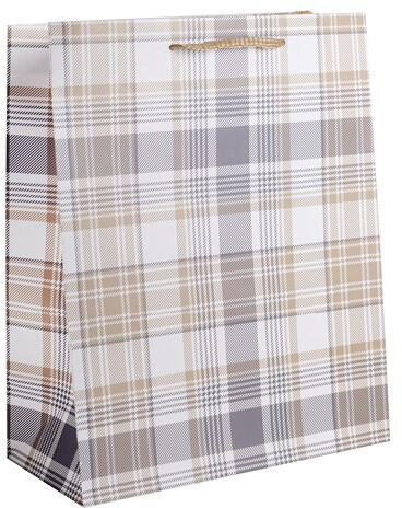 Dísztasak matt 18x23 cm szürke drapp kockás " M " méretű dísztasak anyag: 210 g/m2 súlyú papír formátum: álló felület: matt fogantyú: szalagfül