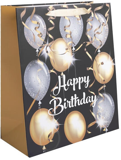Iris papírtasak matt, "happy bithday" felirattal, fekete alapon, arany/ezüst lufik 31*42 cm PAPÍRTASAK MATT, "HAPPY BITHDAY" FELIRATTAL, FEKETE ALAPON, ARANY/EZÜST LUFIK 31*42 CM