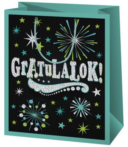 Exkluzív Gratulálok! mintás ajándéktáska 18x23x10cm Hivatalos magyarországi forgalmazótól. Leírás: Ez az exkluzív „Gratulálok! mintával ellátott ajándéktáska remek választás bármilyen alkalomra, ha valamely kedves ismerősünket szeretnénk megünnepelni. Legyen szó születésnapról, ballagásról vagy akár házasságkötésről, az elegáns, ugyanakkor színpompás minta