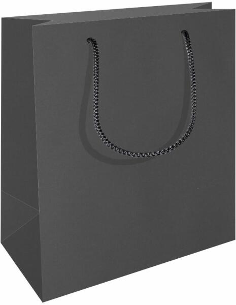 Fekete színű zsinórfüles ajándéktáska, A5 álló méretben. Alapanyag: 150g/m2 prémium papír, matt fóliával, 400g/m2 talp és fülkarton erősítéssel, 5mm vastag 2x38cm hosszú PP zsinórfüllel.