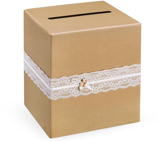 Ajándék-gyűjtő doboz, kraft papírból, fehér csipkével, világos rózsaszín virágokkal és szív alakú medállal, Vintage Collection, mérete 24x24x24 centiméter.