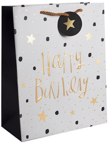 Dísztasak matt 18x23 cm fehér/arany Happy Birthday felirattal " M " méretű dísztasak anyag: 157 g/ m2 súlyú papír formátum: álló felület: matt fogantyú: zsinórfül