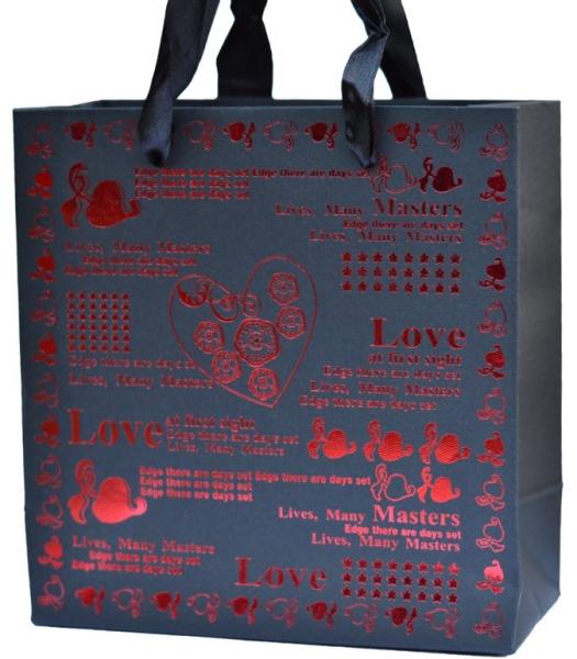 Fekete papírtasak, piros felirattal, ajándékozáshoz, Love felirattal. Mérete: 14,5 x 15 x 7 cm