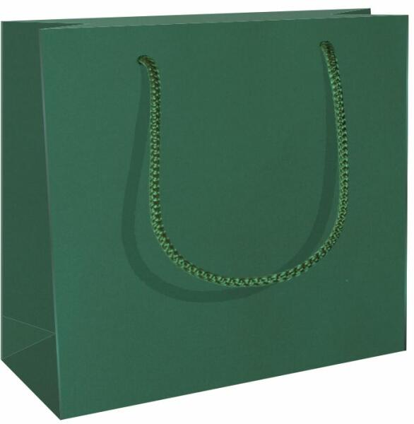 CD méretű, zöld színű zsinórfüles papírtasak matt fóliával. Ideális megoldás olyan butikok, ajándékboltok, kiskereskedők számára, akik kisebb termékeket szeretnének elegáns megjelenésben átadni. A tasak méretei: szélesség: 15 cm magasság: 15 cm talp szélesség: 8 cm 150 g/m2 prémium minőségű, FSC minősített Pergraphica alapanyagú papírból készült. 400 g/m2 fü