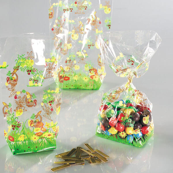 Celofánzacskó vidám és ünnepi mintákkal. Folia celofánzacskó: Díszített és jó minőségű celofánzacskó. Főként kisebb ajándékok, gasztroajándékok csomagolására. Kiválóan alkalmas ünnepekre, mint a Húsvét. A gyerekek imádni fogják a mintás kis csomagot, amely csokit, gyümölcsöt és játékokat tartalmaz. A zacskó száját lehajthatjuk, ragasztóval rögzíthetjük