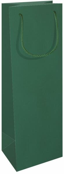 Zöld színű zsinórfüles ajándéktáska, italos méretben. Alapanyag: 150g/m2 prémium papír, matt fóliával, 400g/m2 talp és fülkarton erősítéssel, 4mm vastag 75cm hosszú PP zsinórfüllel.