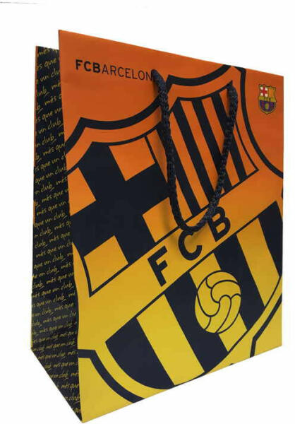 Barcelona ajándékszatyor narancs címeres Képviseld a kedvenc futball csapatodat ezzel a stílusos Barcelona ajándékszatyorral! A tasak narancs színben pompázik, melyen fekete címer díszeleg. A tasak elején található a csapat híres címere, így mindenki számára egyértelmű lesz, melyik csapatot támogatod. A 23*19*10 cm méretű ajándékszatyor tökéletes választás lehet meccs