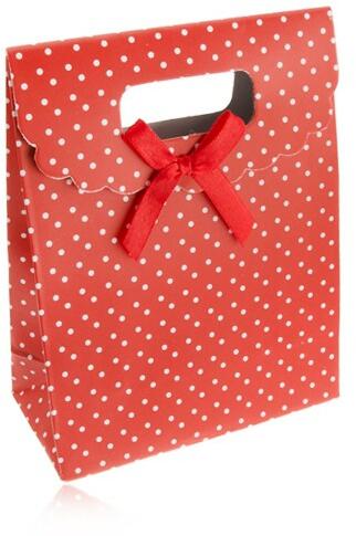 Ajándéktáska papírból piros árnyalatban és matt felülettel fehér pontokkal. A felső rész lehajtható és tépőzárral záródik. A táskán egy dísz piros masni is található és egy kivágás, amely a táska tartására szolgál. Méretek: 125 x 160 x 60 mm