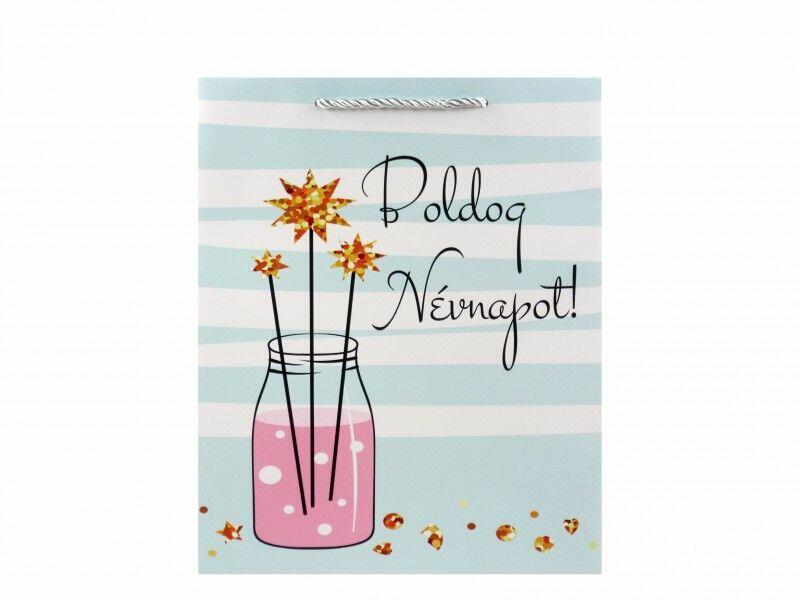 Ajándéktasak Boldog Névnapot csíkos pasztell kék nagy 26x12,5x32cm 02095 Dísztasak LBefoglaló méretek 26x12.5x32 cmAnyaga papír
