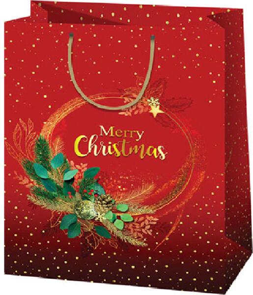 Merry Christmas piros nagy méretű ajándéktáska 24x35x9cm Hivatalos magyarországi forgalmazótól. Leírás: Old meg egyszerűen a karácsonyi ajándékok csomagolását egy ilyen mutatós dísztasak segítségével. A nagy méretű tasakban kényelmesen elférnek a meglepetések, a vörös alapszín, az arany pöttyökkel és a Merry Christmas felirattal pedig illik az ünnepekhez! A nagy m