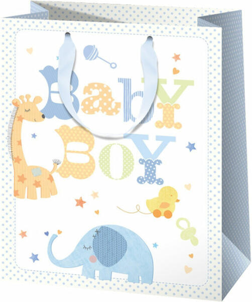Baby Boy felirattal díszített papírtáska rejtheti az ajándékokat. A nagy méretű, álló kialakítású ajándéktáska kiváló minőségű, telített színekkel készített nyomata szép megjelenést, míg a lakkozott vastag papír és az erős zsinórfüles kialakítás tar...