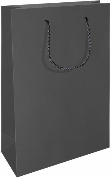 Fekete színű zsinórfüles ajándéktáska, A4 álló méretben. Alapanyag: 150g/m2 prémium papír, matt fóliával, 400g/m2 talp és fülkarton erősítéssel, 5mm vastag 2x38cm hosszú PP zsinórfüllel.