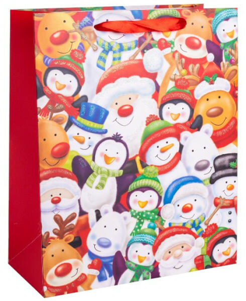 Karácsonyi ajándéktasak 26x32 cm - Mikulás és barátai Karácsonyi ajándéktasak 26x32 cm-es méretben kínál egy bájos és vidám megoldást a karácsonyi ajándékozásra. A táskát Mikulás és barátai díszítik , ami biztosan mosolyt csal mindenki arcára. Az ajándéktasak anyaga tartós, így könnyedén elbírja az ajándékokat. A 26x32 cm-es méret ideális a közepes méretű