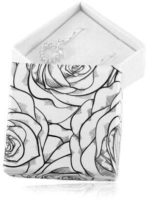 Doboz eljegyzési gyűrűre vagy fülbevalóra, amelynek teteje fehér színű, fekete rózsavirág minták lenyomatával díszítve. A doboz alsó részének enyhén strukturált felülete van, belsejében fehér párnácska található, bemetszésekkel az ékszerre. Alkalmas két gyűrűre, fülbevalóra vagy medálra. Méretek: 50 x 50 x 25 mmBelső méretek: 45 x 45 mm
