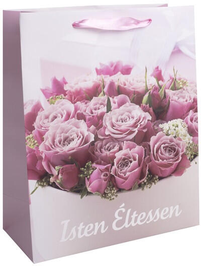 Iris papírtasak matt, "isten éltessen" felirat, rózsaszín rózsadoboz 11*14 cm PAPÍRTASAK MATT, "ISTEN ÉLTESSEN" FELIRAT, RÓZSASZÍN RÓZSADOBOZ 11*14 CM