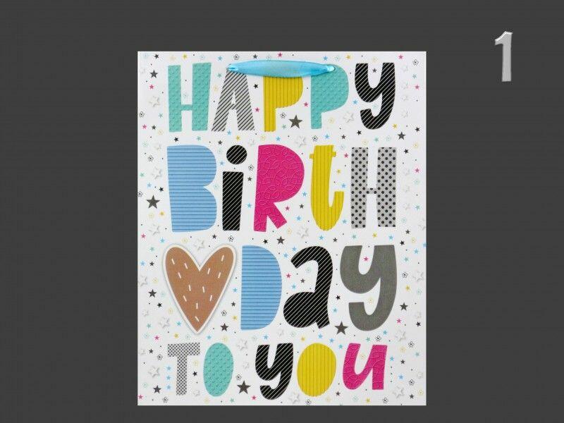 Ajándéktasak Happy Birthday nagy 26x10x32cm 4féle 02871 4 féle típus választhatóDísztasak LBefoglaló méretek 26x10x32 cmAnyaga papír