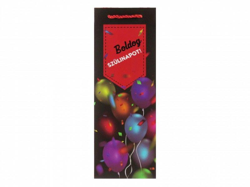 Ajándéktasak italos Boldog Szülinapot lufis fekete 12,5x10x34cm 02142 Befoglaló méretek 12.5x10x34 cmAnyaga papír