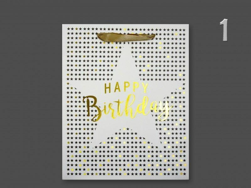 Ajándéktasak Happy Birthday arany csillagos nagy 26x10x32cm 4féle 02786 4 féle típus választható Befoglaló méretek 26x10x32 cmDísztasak LAnyaga papír