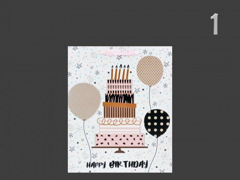 Ajándéktasak Happy Birthday közép 18x3,7x23cm 4féle 02870 4 féle típus választhatóDísztasak MBefoglaló méretek 18x8x23 cmAnyaga papír
