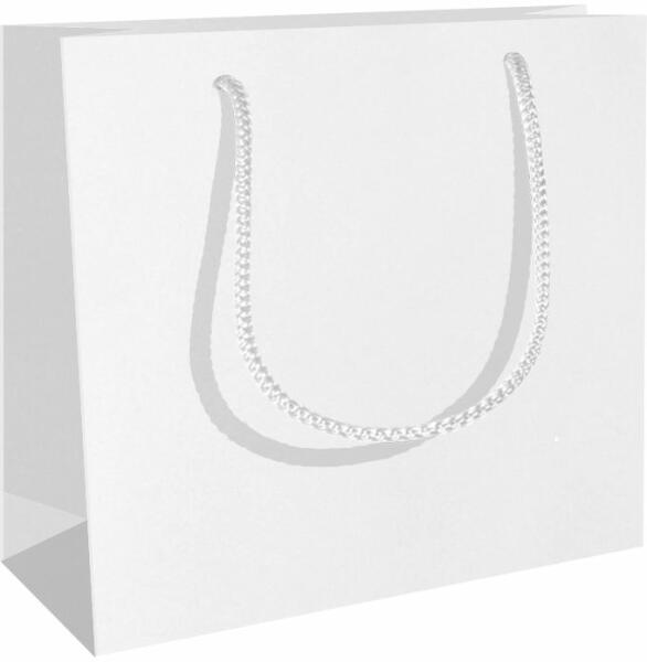 CD méretű, fehér színű zsinórfüles papírtasak matt fóliával. Ideális megoldás olyan butikok, ajándékboltok, kiskereskedők számára, akik kisebb termékeket szeretnének elegáns megjelenésben átadni. A tasak méretei: szélesség: 15 cm magasság: 15 cm talp szélesség: 8 cm 150 g/m2 prémium minőségű, FSC minősített Pergraphica alapanyagú papírból készült. 400 g/m2 f