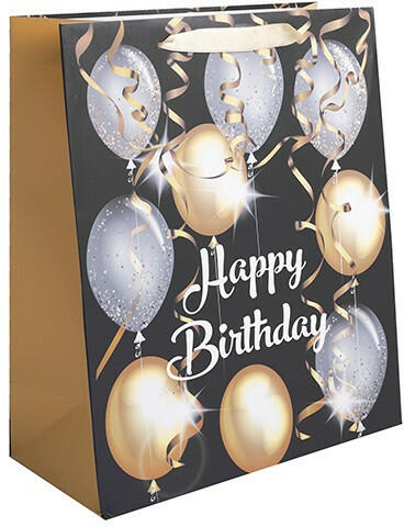 Dísztasak matt 11x14 cm arany és ezüst lufik Happy Birthday felirattal méret: 11x36 cm arany és ezüst lufik Happy Birthday felirattal