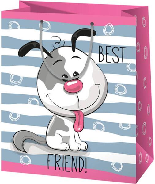 Szürke-fehér kutyás normál méretű ajándéktáska 11x6x14cm-es Hivatalos magyarországi forgalmazótól. Leírás: Ezzel a szürke-fehér kutyával díszített ajándéktáskával minden kutyabarát szívébe belopózol! A normál méretű, 11,4x6,4x14,6 cm-es táska ideális választás kisebb ajándékok, például könyvek, ékszerek vagy apróságok szállításához. A fényes laminált