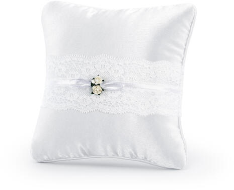 Gyűrűtartó párna, fehér matt szövetből, csipkével és fehér rózsákkal, jegygyűrűkhöz, White Heart Collection, 16x16 centiméteres méretben.