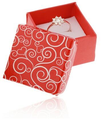 A doboz gyűrűnek, fülbevalónak vagy medálnak piros színű és a felső része fehér színű mintákkal és szívekkel van díszítve. A doboz belsejében egy fehér párna található, kivágásokkal az ékszernek. Alkalmas gyűrűnek, fülbevalónak vagy medálnak. Méretek: 43 x 43 x 32 mmBelső méretek: 37 x 37 mm