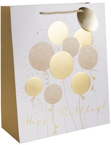 Dísztasak matt 18x23 cm arany lufik Happy Birthday! felirattal 18x23 cm-es méretű dísztasak anyag: 210 g/ m2 súlyú papír formátum: álló felület: matt szalag füles