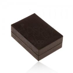 Az ajándékdoboznak fülbevalóra vagy nyakláncra téglalap alakja és fényes, műbőr felülete van barna színben, amely aszimmetrikus, hosszúkás bemetszések mintájával van díszítve. A doboz belsejében egy sima, fehér párna található, bemetszésekkel az ékszerre. Alkalmas hosszabb fülbevalóra vagy nyakláncra. Méretek: 45 x 65 x 22 mmBelső méretek: 42 x 55 mm