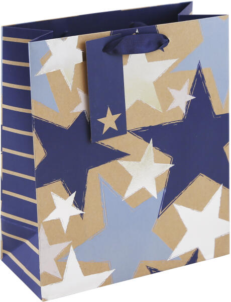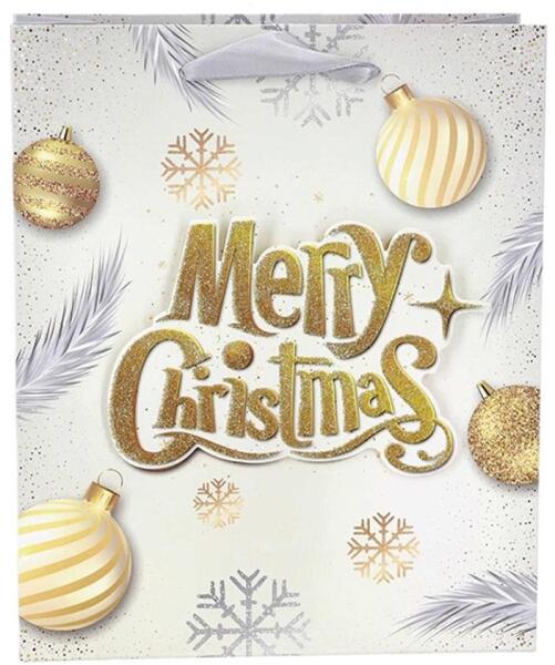 Dísztasak CREATIVE Simple S 23,5x19,5x8 cm karácsonyi feliratos 3D glitteres szalagfüles Papír ajándéktasak, matt felületű, 3D-s és glitteres. 12 db/csomag, 4 minta/csomag. A minta nem választható.
