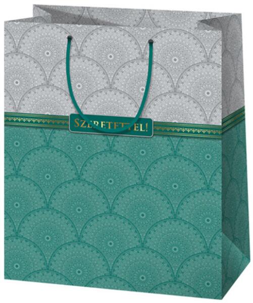 Szeretettel! elegáns közepes ajándéktáska arany berakással 18x10x23cm Hivatalos magyarországi forgalmazótól. Leírás: Ez a képen látható zöld-szürke színű ajándéktáska igazán elegáns és stílusos megjelenést kölcsönöz ajándékainknak. A táska mérete 170 x 230 x 90 mm, amely elegendő helyet biztosít ahhoz, hogy kényelmesen elférjen benne az ajándék. Az arany szí