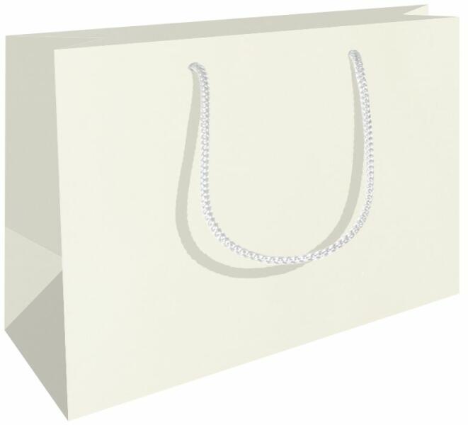 Vaj színű zsinórfüles ajándéktáska, A5 fekvő méretben. Alapanyag: 150g/m2 prémium papír, matt fóliával, 400g/m2 talp és fülkarton erősítéssel, 5mm vastag 2x38cm hosszú PP zsinórfüllel.