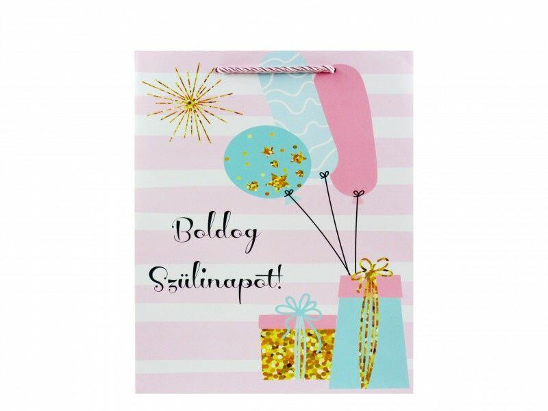 Ajándéktasak Boldog Szülinapot csíkos rózsaszín nagy 26x12,5x32cm 02099 Dísztasak LBefoglaló méretek 26x12.5x32 cmAnyaga papír