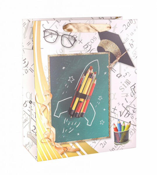 Ajándéktasak ballagásra 32x26cm Ajándéktasak ballagásra 32x26cm kiválóan alkalmas arra, hogy nagyobb terjedelmű ajándékot vagy akár több kisebbet is beletegyünk. Nem kell a csomagoló papírral bajlódni többé, egyszerűen csak szépen belepakoljuk a meglepetést és kész a csomagolás. A ceruzák, matematikai számok, egyenletek, díszítés miatt tökéletesen illik ballagási c