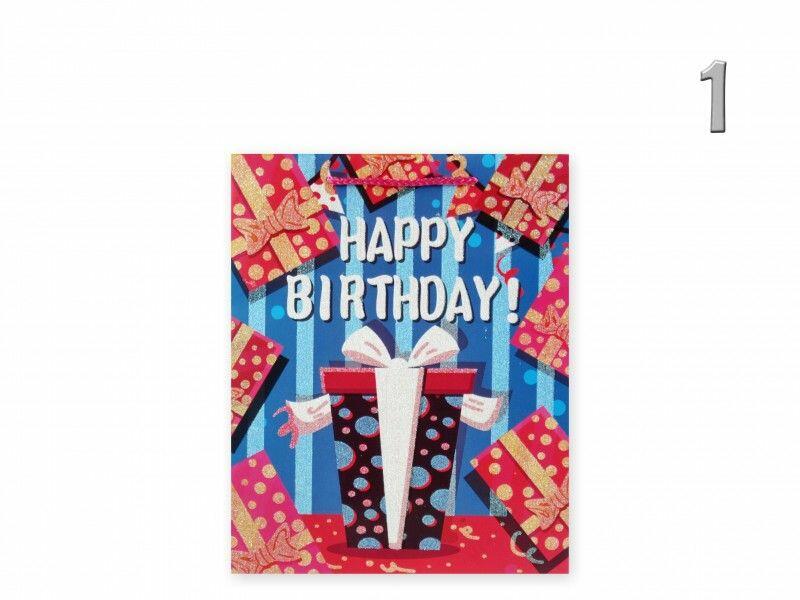 Ajándéktasak Happy Birthday retró glitteres közép 18x8x23cm 4féle 02829 4 féle típus választható Befoglaló méretek 18x8x23 cmDísztasak MAnyaga papír